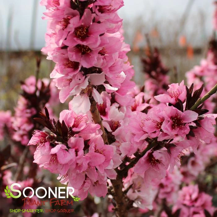 Buy Bonfire Ornamental Patio Peach online. A dense, shrubby patio peach tree that has long, dark red leaves that retain their color throughout the growing season. Double pink flowers add to its unusual character in the spring. The foliage is resistant to bacterial leaf spot. Introduced by the University of Arkansas.