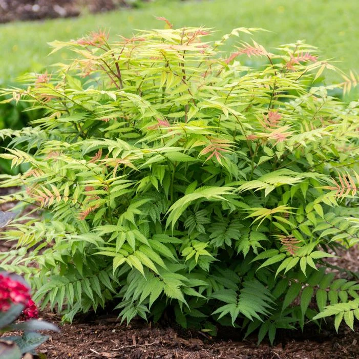 Buy Cherry On Top™ Sorbaria online. This amazing shrub is exceptionally hardy and features chartreuse-yellow leaves that are reddish in color when very immature. As the plant grows throughout the season, it produces white flowers on panicles that fade to a reddish seed pods that open to dark brown seeds. It’s a beautiful and tropical looking shrub, and will be a favorite in your landscape!