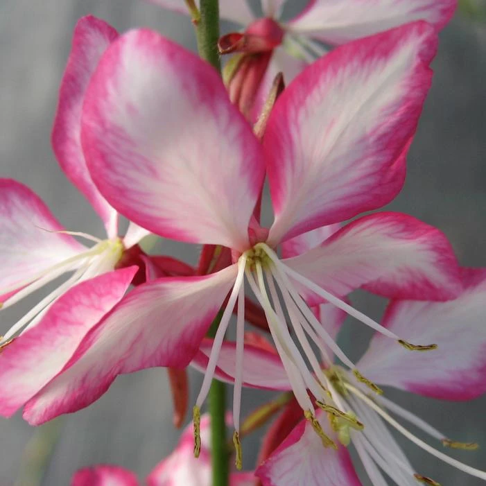 Buy Rosy Jane Wand Flower online. Rosy Jane Wand Flower definitely stands out from other Gaura, as it features a mostly white flower that is bright pink on the edges of each flower. Long, grass-like stems come up from the ground, and it has dark maroon flower buds and green leaves. It is a unique and beautiful perennial that works well in full sun areas.