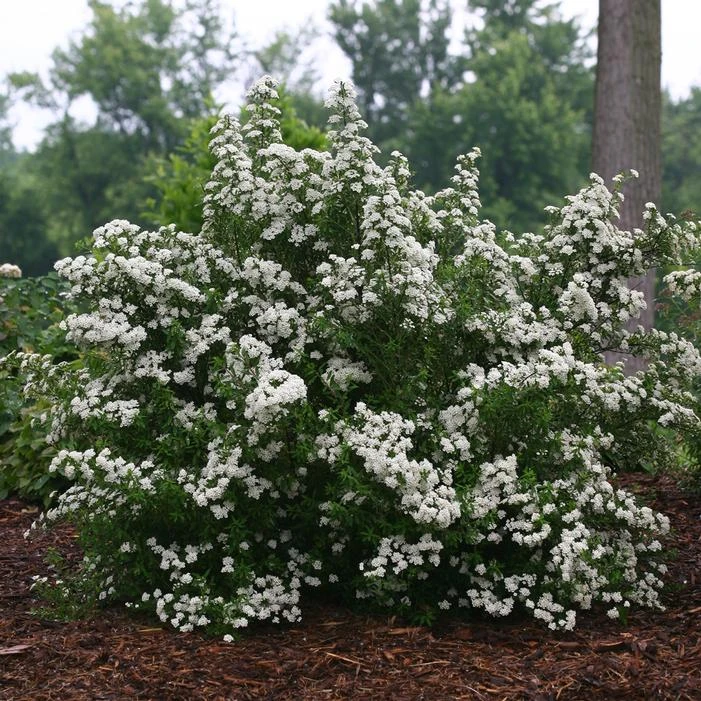 Buy Wedding Cake® Spiraea online. Every spring, landscapes everywhere are graced with romantic white-flowering spiraea like this one. Wedding Cake® Spiraea, however, is a smaller, more compact plant than its old-fashioned cousins, making it perfectly suited to any sized yard. Neat, blue-green foliage sets off the pure white flower clusters, and the plant has a rounded, rather
